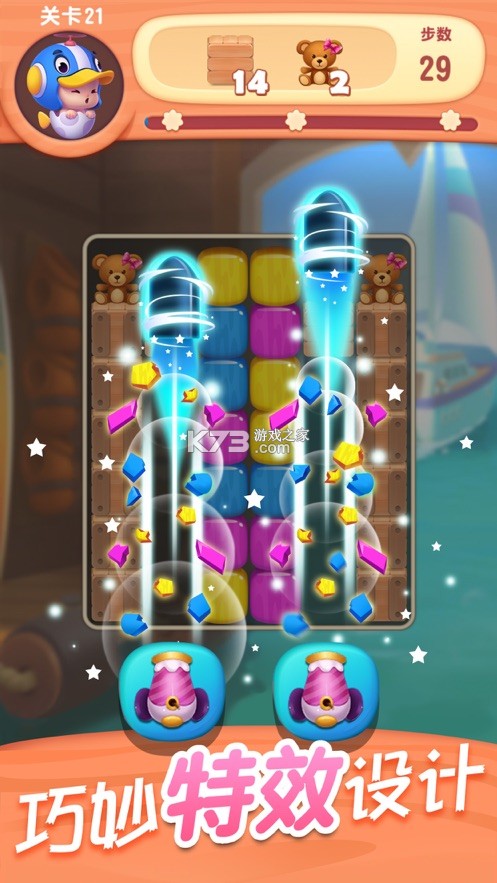 上百个精心设计的全新关卡,不仅能消除彩色方块,还能消除草垛、纸箱,一切的一切都是为了爱消除的你,等你来挑战!