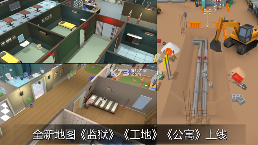 二十张地图:公寓、监狱、工地、城堡、赛车场、医院、军事要塞、办公室、空间站、航天基地、小镇、码头、酒店、火星基地、别墅、巨人厨房、野外营地、训练营、教堂、游戏世界。每张地图,躲藏者可以伪装成60多种物品。