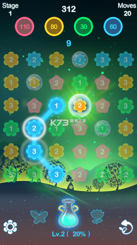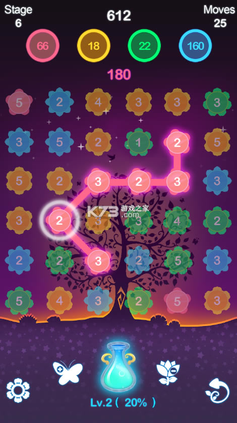 游戏的核心玩法包括基本的双匹配3规则,即颜色和数字都匹配。当颜色和数字匹配时,花上的数字为 10 倍,分数也为 10 倍。游戏消除的分数不仅可以减少目标所需的分数,还可以作为能量进入魔法瓶。