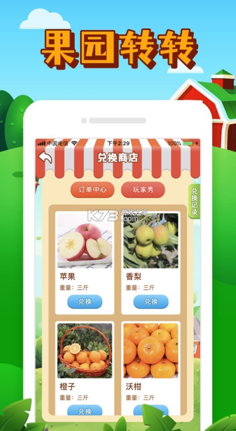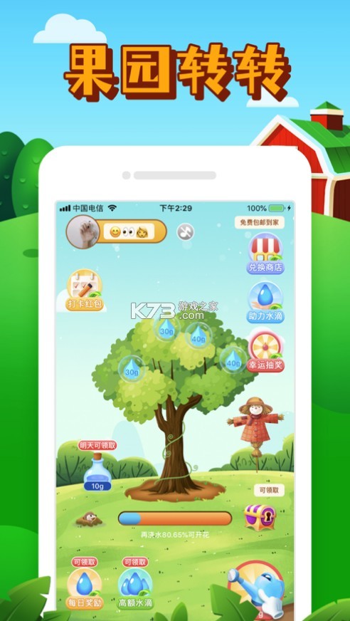 《果园转转》是一款模拟种树的休闲娱乐手机游戏,您可以在闲暇的时间来进行种树浇水,享受收获果实的乐趣,完成种植也可以兑换实际水果以及其他的物品包邮到家。