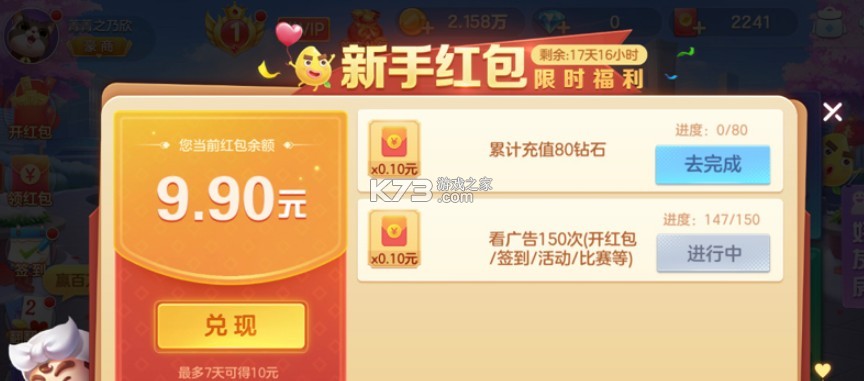 打牌赢了能得话费。新玩家签到做任务得10元话费。里面有1元免费赢话费的。