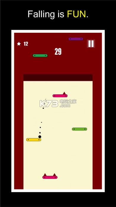 《Fall Far》这是一款采用是简约的游戏画面感的一款趣味性的游戏,在游戏中将进行控制一个黑色的球进行前行与翻滚,在其过程中你会经常的摔跤,进行避开所有暗红色的物体。