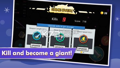 你得到的点数越多,升级的级别越高,你的角色和武器就越大,这意味着你可以攻击更大的区域。同时,即使你被击中一次,你也会立即死去。即使你不小心,新手也会杀了你。当你很小的时候,用速度助推器猛击并杀死更大的敌人。