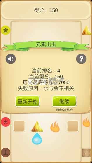 《元素出击》一款以金木水火土五行为元素开发出来的休闲游戏,五者相关的一款手游,相关性能够在一起然后获得得分,得分越高就越好哦,看看你能够获得多少分。