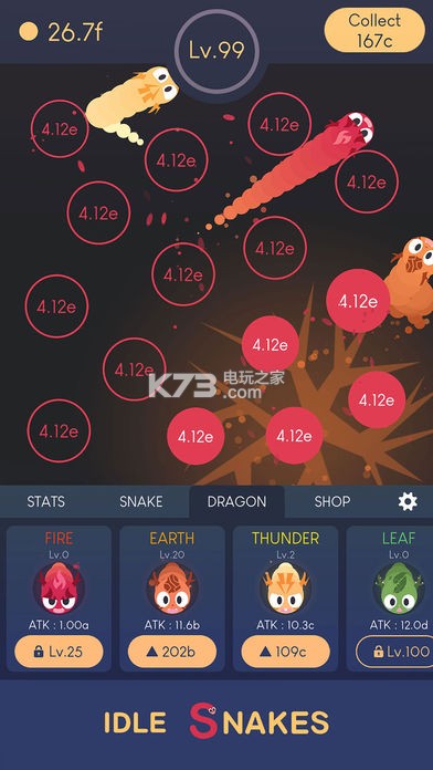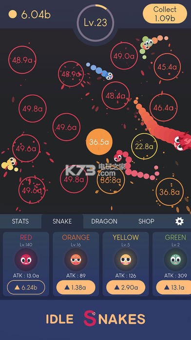 《Idle Snakes(贪吃蛇打球球)》收集能量培养蛇蛇长大,不断的来吞噬蛇蛇快速成长最高,轻松放置即可玩,自动来吞噬球球,多种蛇蛇皮肤选择,解锁更多新蛇蛇。