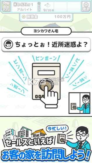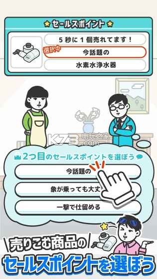 《什么都能卖给你看(なんでもセールスマン)》是由日本毒厂G.Gear.inc又一新打造的游戏,游戏的玩法和动作都十分的魔性,玩家将化身为推销员,用你的三寸不烂之舌来说服顾客,成功的将商品卖出去。