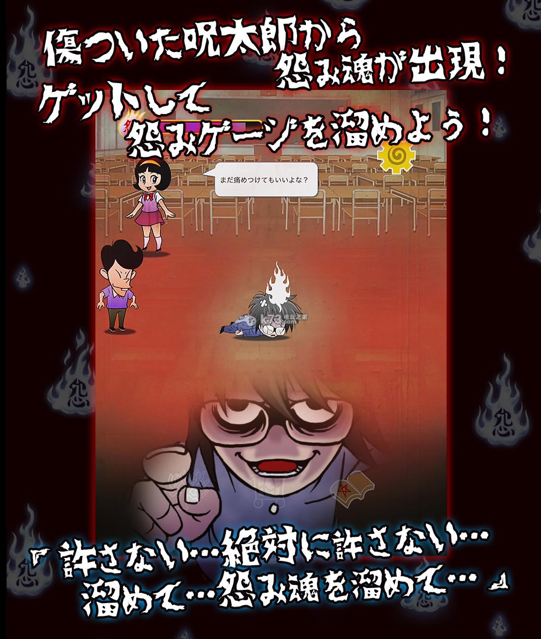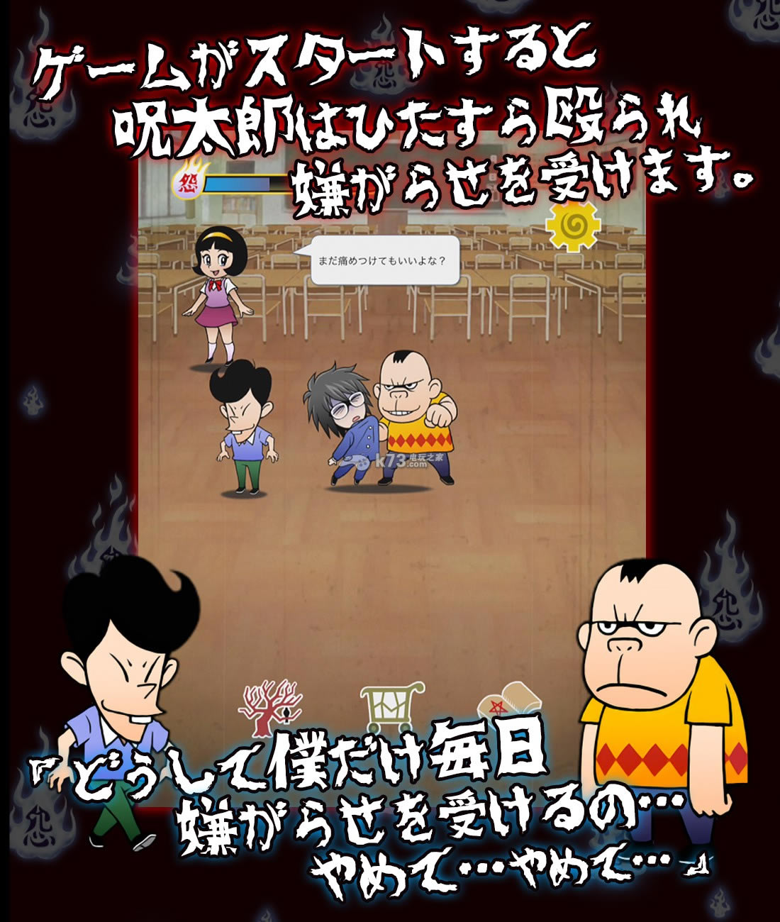 《复仇的咒太郎》游戏整体采用阴暗风展开,玩家需要通过点击屏幕累计怨念,当怨念累计到一定数量的时候就可以运用超能力惩治欺负主角的人了,是一款非常有意思的游戏。
