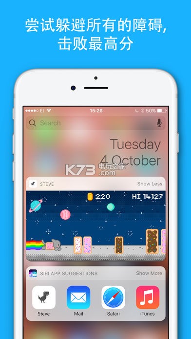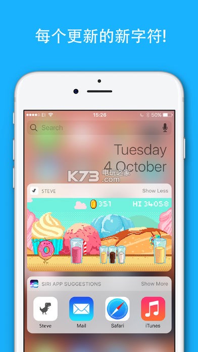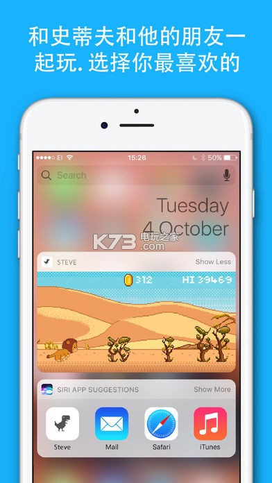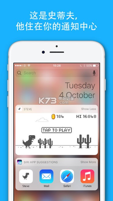 满足史蒂夫,跳恐龙,生活在您的通知中心。玩史蒂夫在任何时间,在任何地方,只要在你的屏幕上从上往下拖动显示通知中心和新dino-friend会在那里等待你!