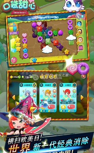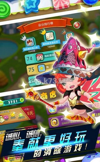 你是一位守护着一群可爱萌宠的美丽精灵,隐居在地球上经营着一家非常棒的糖果店,有一群奇怪的外星人试图绑架这些萌宠,你要做的就是发挥精灵的魔法,将三块同样的糖果找出来,找出的糖果越快越多,精灵补充到的能量就越大,消灭外星人的速度就越快。经营糖果店,打败大BOSS。