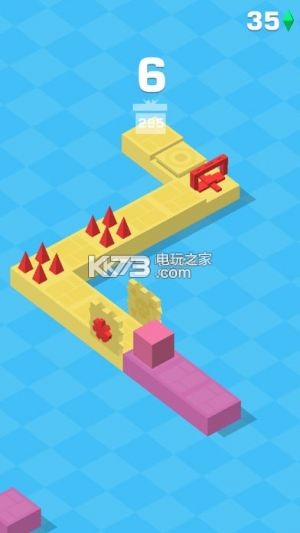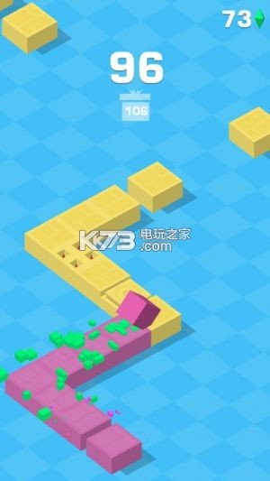 游戏的操作很简单,控制道路上的小方块,在恰当的时机点击屏幕,越过障碍,避免跌落或损伤。