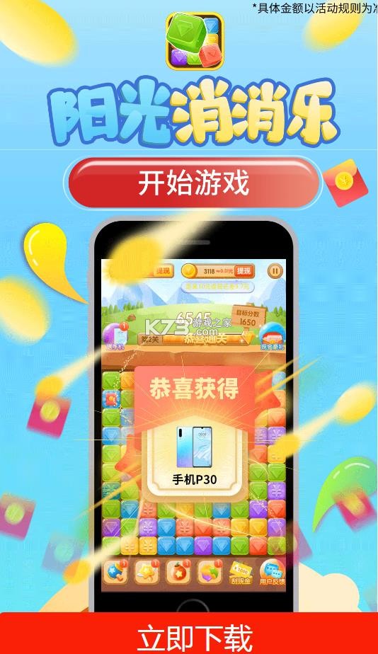 阳光消消乐是真的可以消除领红包哦,不仅如此还可以抽手机