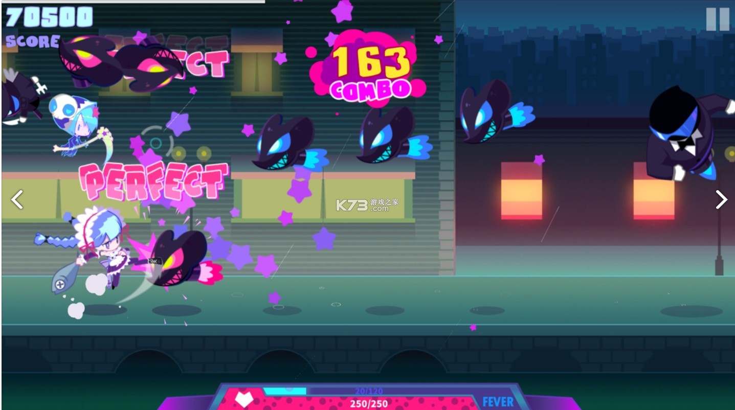 游戏以跑酷玩法为核心,玩家需要通过跟随音乐节奏屏幕左右部分的方式来控制角色攻击上下位置不同的敌人。