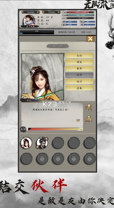 江湖中人皆可交往,或结拜结婚,或不共戴天,你的行为将影响他们的态度。