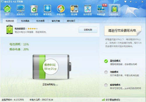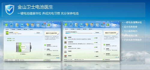 为解决诸如“电池寿命、续航时间短”这样令笔记本用户头疼的难题,金山卫士历经一个多月成功开发出适合笔记本用户的电池保养与省电管理软件!推荐本本用户日常使用,延缓电池老化,减少电池损耗,提高电池寿命!拥有电池医生,您就够在出差旅行、办公会议等场所有效增加电池续航时间,保障工作、生活、娱乐不会因电池的烦恼而中断!