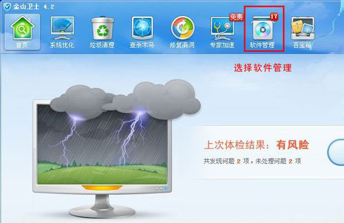 2.打开金山卫士,在上面找到“软件管理”。