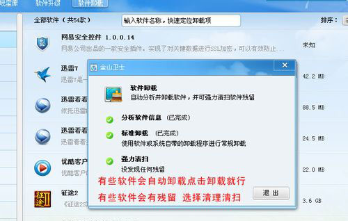 1.使用金山卸载后会出现软件自带卸载功能 按照步骤卸载的时候不要点击取消不然会中断卸载。