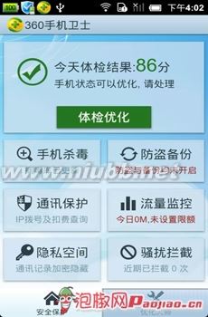 首先我们评比的是双方的软件界面UI。360手机卫士的整体界面以蔚蓝为主,和LBE、QQ手机管家一样采用的是经典的蓝天白云效果;软件的功能选项以板块的形式整齐罗列,所有的功能分类一目了然。