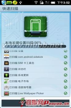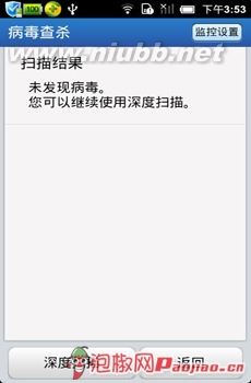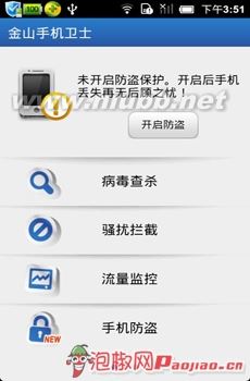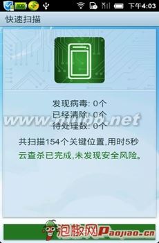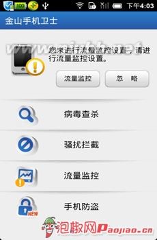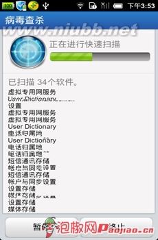 金山手机卫士的病毒查杀功能只有这一项,在首页点击之后就开始查杀。