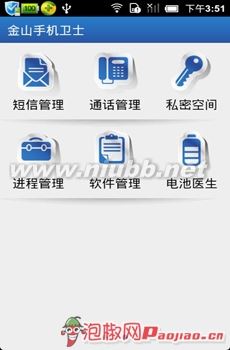 金山手机卫士采用的是简约明了的手法,整体界面都是纯白色,软件将最主要的功能布局与首页,次级功能放在第二页,使软件的功能布局大小有序,目标明晰。