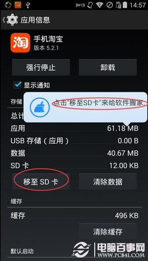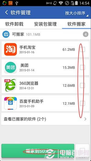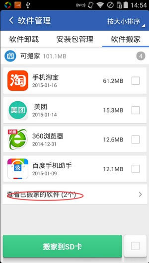 4、点击后,会出现可搬家的软件,选择点击【搬家到SD卡】,接着会提示要点击【移至SD卡】,点击移动就可。如下图