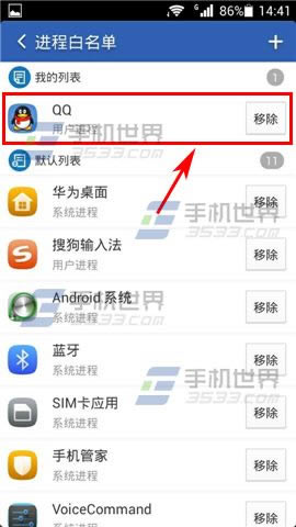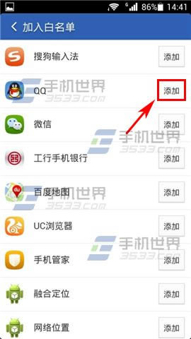 3)找到要加入白名单的应用,小编此处以【QQ】为例,点击QQ右侧的【添加】,就可以把QQ添加到进程白名单了。(如下图)