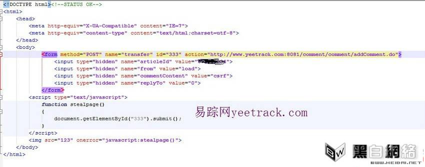 这样图片加载失败,就是自动提交form表单。将这个html上传到我们自己的服务器上,将html链接发送给A、或者发布在网站B上,等待A来点击。A点击后,载入页面img载入失败,就会触发form表单的提交操作,并且附带上用户A在网站B的cookie,这样就冒充A在网站B上发布了帖子。