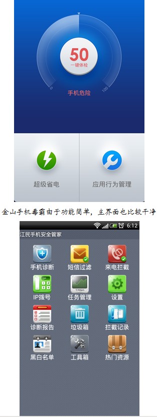 而另几款安全软件的界面则比较相似,在上半部分提供了一键扫描功能,可快速检查出手机的安全隐患,下方则是常用的功能按钮,如垃圾清理、电池管理等,只是在配色和图标上有一些区别,布局基本一样。其中金山手机毒霸和瑞星手机安全软件的配色比较单一,而且几乎没有动画效果,得分稍低。