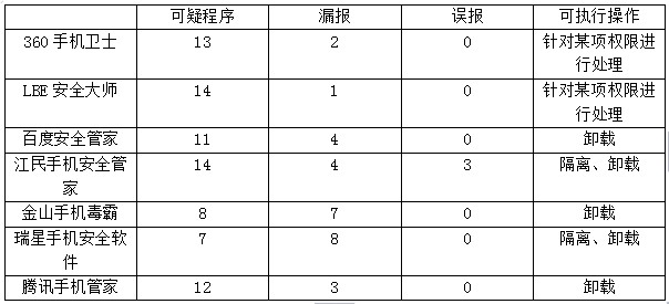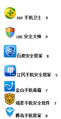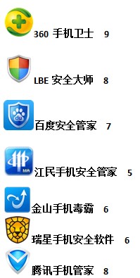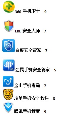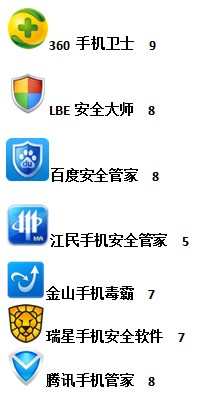 经过实际测试,我们可以清楚地看到,就我们准备的样本而言,LBE安全大师的扫描能力是最强的,360手机卫士和腾讯手机管家紧随其后,成绩非常接近。而金山手机毒霸和瑞星手机安全软件的成绩不够理想,许多盗版程序没有扫描出来。江民手机安全管家在这一环节表现仍然不好,有几款官方应用都会被提示为非法软件,存在误报的情况。