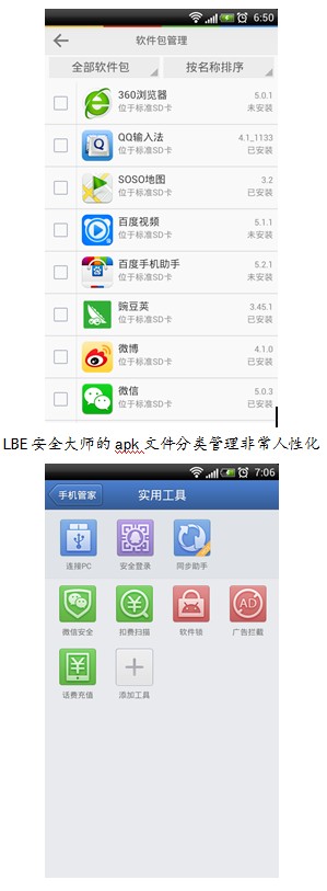 大家下载apk文件安装之后,大多数情况都没有手动删除这个文件,久而久之越存越多,比较占用宝贵的内存空间。而360手机卫士、LBE安全大师和腾讯手机管家这三款安全软件都提供了apk文件管理功能,其中最有特色的当数LBE安全大师,在自动扫描之后,会罗列出所有apk文件,并且会显示出该apk文件是否安装、是否最新版、是否经过认证等,并可以进行分类批量操作,我们可以快速找出过期版本一次性删除,比较方便。另两款则只是可以快速扫描出来,没有提供详细的分类,只能自己判断是要安装或是删除。