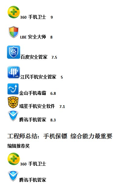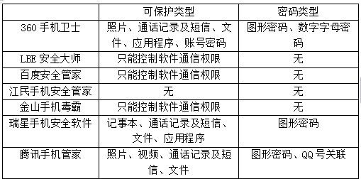 在这个部分,主要测试这7款安全工具的隐私保护功能是否全面,主要针对应用保护以及短信、通话记录以及照片等个人文件的保护,根据各自的功能进行评分。