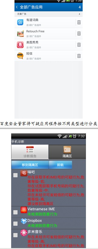 我们准备了20个apk文件样本,其中5个正常程序,5个广告程序,5个含有敏感权限,5个被篡改的同名盗版程序。测试每款软件之前都将手机恢复出厂设置,格式化存储卡,再安装它们,并分别用这7款安全工具进行扫描(在WiFi环境下开启联网云查杀),测试它们对应用程序的扫描能力。