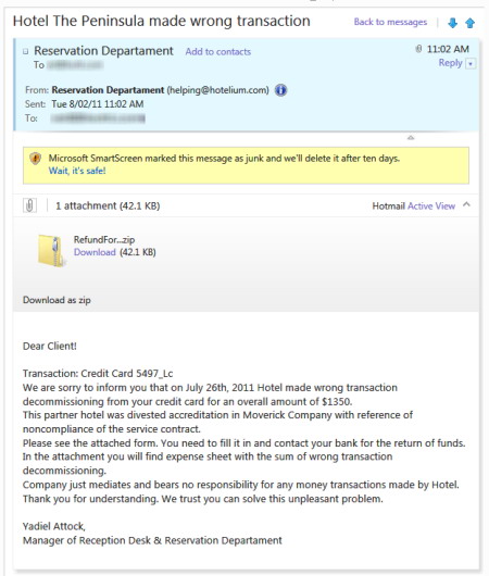 早在5月份,我就非常关注苹果后卫的活动情况。而最近,我又开始关注来自不同网络的新一轮攻击。它们采用的是一种针对Windows用户的木马。该木马利用电子邮件进行传播,伪装成为退款主题的Zip格式附件。从表面上来看,邮件就象来自一家酒店。主题行的说明是“错误事项”,内容则是酒店从收件人信用卡上收取了多余费用,因此,需要收件人填写索赔表(附件)以便获得退款。
