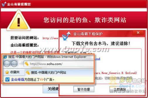 只要开启金山毒霸“上网保护”,金山毒霸会自动屏蔽广告,还你一个洁净的网络环境,一旦误入钓鱼网站,遭遇网页挂马,或是下载、接收含有木马病毒的文件,金山毒霸会自动拦截,并弹出窗口提醒用户注意防范(如图4),斩断病毒集团的黑手,避免掉进不法分子精心设置的陷阱。