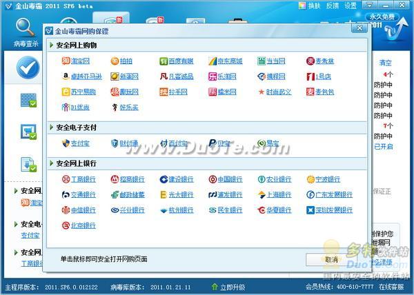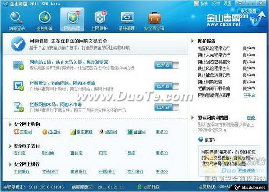 据介绍,金山毒霸“网购保镖”采用了三层防御体系:首先是钓鱼欺诈防御,该层防御采用了金山网址云安全技术,可有效拦截钓鱼、欺诈类假网购网站;其次是恶意文件防御,该层防御采用了文件云安全技术,让木马无法入侵,无法运行;最后一层是网购防火墙,网购防火墙引用了金山独有的安全沙箱技术,即使木马突破了前两层,也无法实施真正的盗窃。