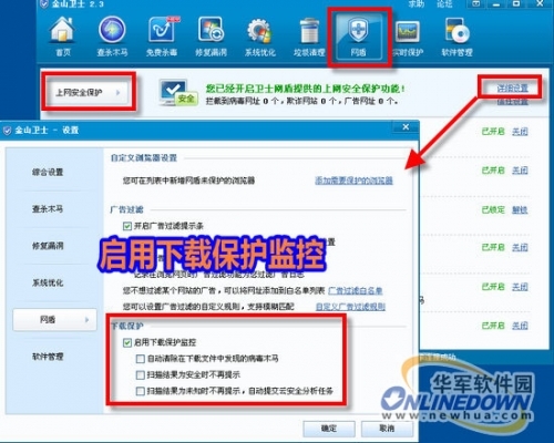小提示:下载保护只是金山卫士上网安全保护的一部分,根据自己的实际需要开启更多上网安全保护可以有效过滤网页木马,拦截钓鱼网站,识别搜索结果,阻止扰民广告。