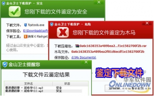 开启保护后,用常用下载工具或浏览器从网络中将文件下载到本地硬盘时,金山卫士会自动对下载回来的文件进行扫描分析,对文件的安全性进行鉴定。如果文件是安全的,弹出绿色窗口提示文件安全,可以放心使用;如果文件中包含有病毒木马,弹出红色窗口提示文件包含木马,建议立即清除;如果下载回来的文件存在可疑的未知病毒,则会提交给云鉴定服务器进行鉴定,并在几分钟内将鉴定结果反馈给用户(如图2)。