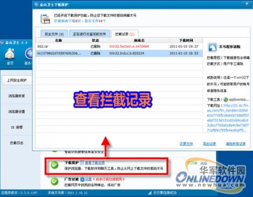 经金山卫士鉴定的所有文件都会自动记录,单击“网盾”窗口“下载保护”右侧“查看下载记录”,打开“保护”窗口,在此可以查看安全文件、正在进行云鉴定的文件和拦截记录。拦截记录中包含文件名、状态、病毒名、下载时间,以及该病毒的拦截原因、拦截方式、威胁说明、下载工具和下载网址等信息,非常详细(如图3)。