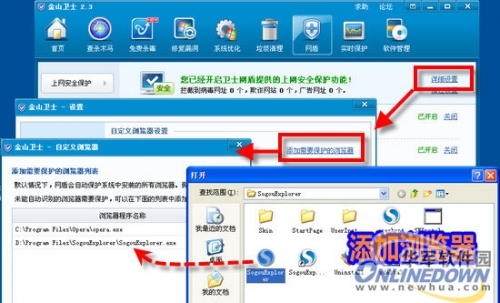 打开金山卫士“网盾”窗口,切换到“上网安全保护”标签卡,单击右上角“详细设置”,弹出“金山卫士-设置”窗口,切换到“网盾”选项卡,单击“添加需要保护的浏览器”,打开“金山卫士-自定义浏览器”窗口,单击“添加浏览器”按钮,弹出“打开”窗口,找到并双击一种浏览器主程序文件,即可将该浏览器添加进来,接受金山卫士的保护(如图4),拓展保护范围。
