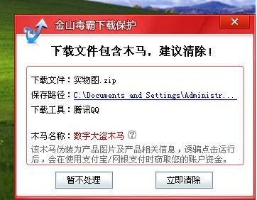 针对新型交易劫持木马的特点,金山毒霸2011 SP5首家完全阻截数字大盗木马,同时,在浏览器下载文件、QQ、MSN、飞信、阿里旺旺等聊天软件传文件的时候,启用了智能云安全鉴定功能,保证下载不中毒。