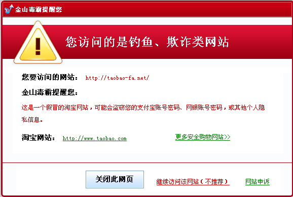 对此,金山网络安全实验室经过长期研究,分析了网络钓鱼目前最常用手段,找到了对付网络钓鱼欺诈的最佳解决方案——网址云安全智能反钓鱼技术。目前,金山毒霸2011SP5已经全面启用了这一技术,即可以通过服务端的自动收集和自动识别,来有效拦截有可能被网民访问到的网络钓鱼网站。
