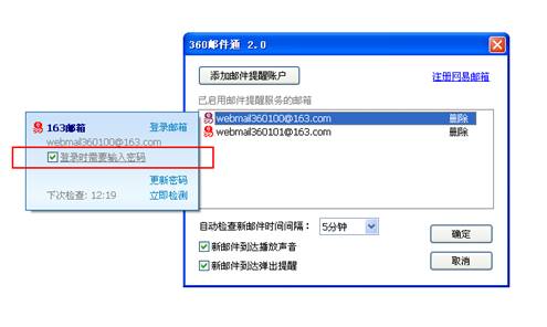 新版的邮件通的安全性能更加突出,通过邮件通登陆邮箱时,会弹出密码验证窗口。只有通过了密码验证,才能登陆到邮箱收发邮件,配合360的专业性,确保网民邮箱账户安全。