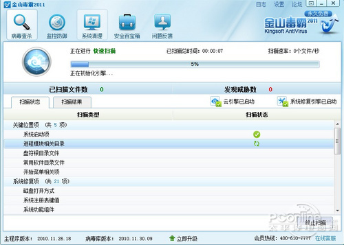 蓝芯II引擎+可信云引擎扫描是金山毒霸2011 的亮点之一