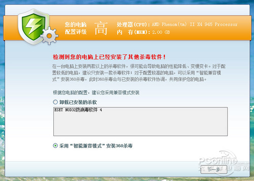 如下图所示,即使是与360杀毒有合作关系的ESET NOD32杀毒软件,360杀毒2.0 一样是会弹出兼容性提示。