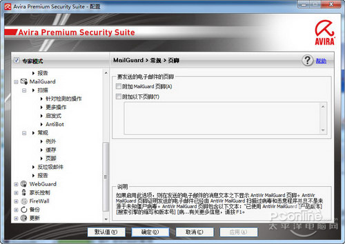 只要可以开启小红伞V10的“附加MailGuard页脚”功能,小红伞就会自动在经过它扫描的电子邮件上标注上“已经经过小红伞安全扫描”的文字标示,这样的标示,足以给收件人一个注重安全的良好印象。
