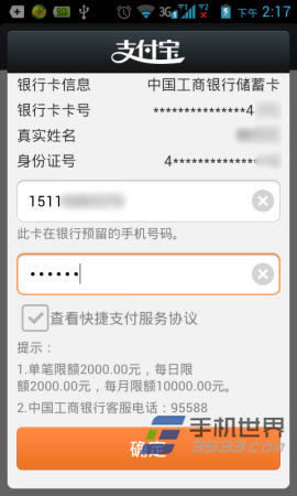 2)写上你要绑定支付宝的银行卡号后,填上你在银行办卡时预留的电话号码,输入支付宝密码。如下图所示: