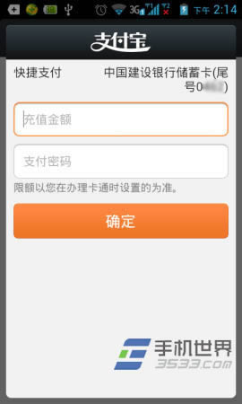3)输入你要充值的金额和支付密码,点击确定,这样你用快捷支付充值支付宝就充值成功了。