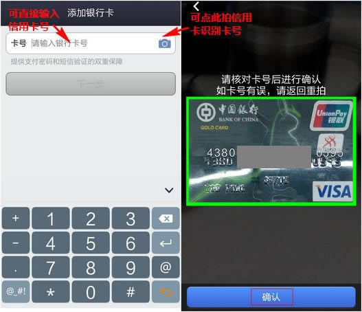 2、用户可手动输入银行卡号,也可以点击右上方蓝色相机图标,通过手机拍银行卡正面的方式识别银行卡号,(仅支持大陆发行的个人类型信用卡);