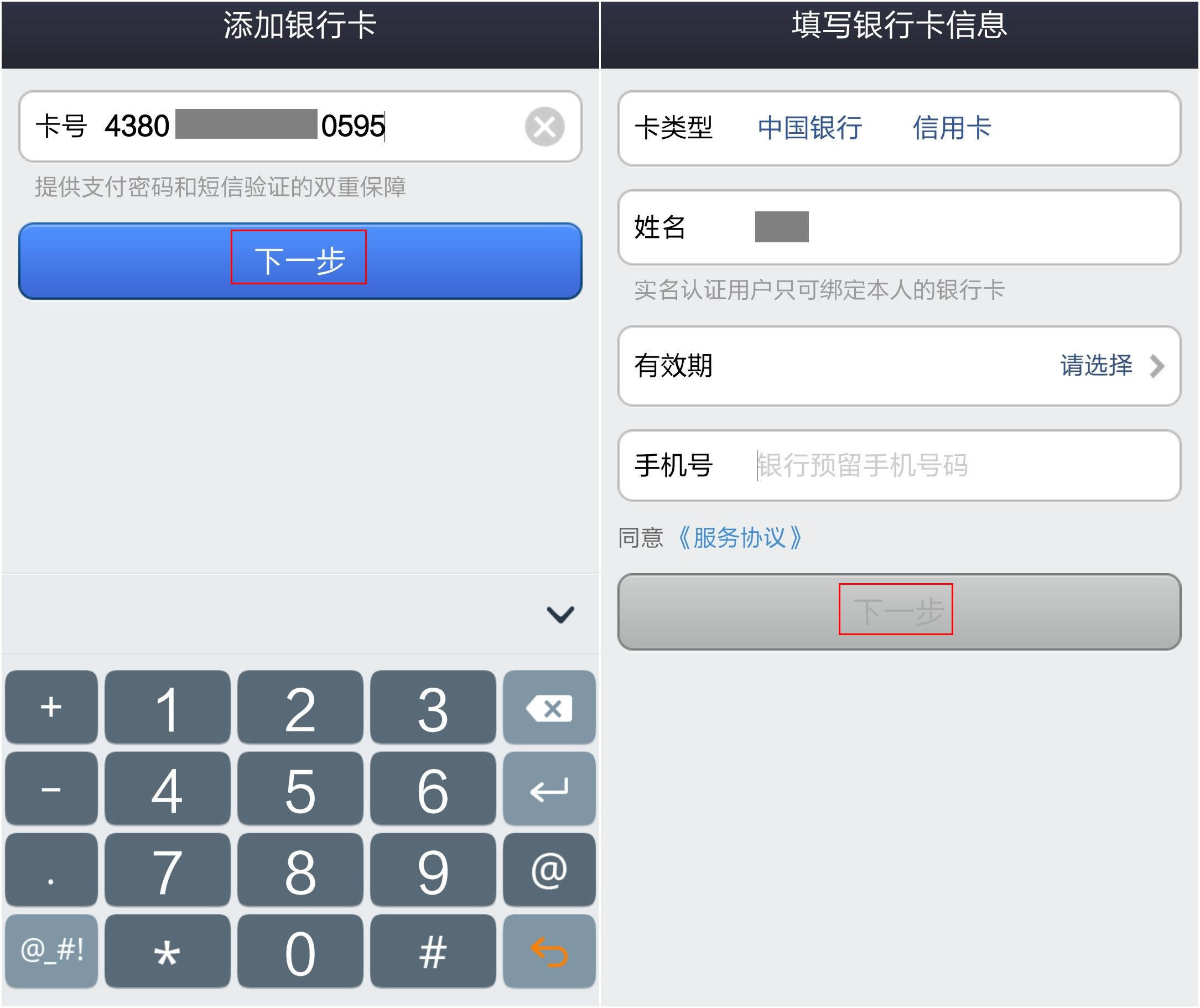 3、用户确认卡号后点击【下一步】,系统读取银行信息,选择信用卡有效期,并填写银行预留的手机号码,点击【下一步】;