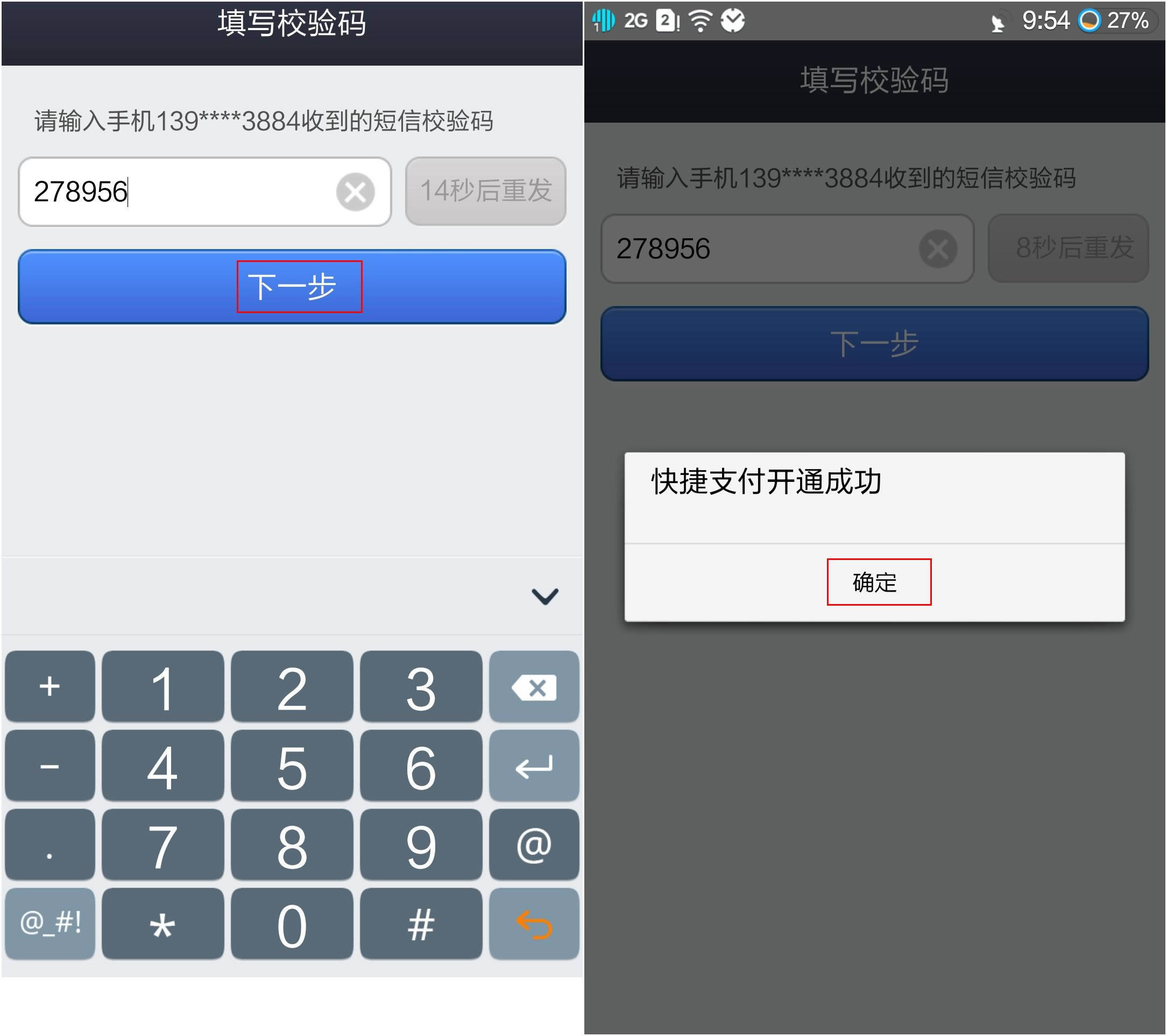 4、银行预留的手机接收短信校验码,确认校验码正确后快捷支付开通成功,点击【确定】返回银行卡列表,可以在银行卡列表中查看新开通的银行卡。