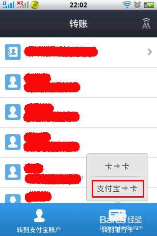 单击以后就会出现两个选项,一个是卡卡之间的转账,还有一个就是支付宝和卡之间的转账,我们选择的是第二个。